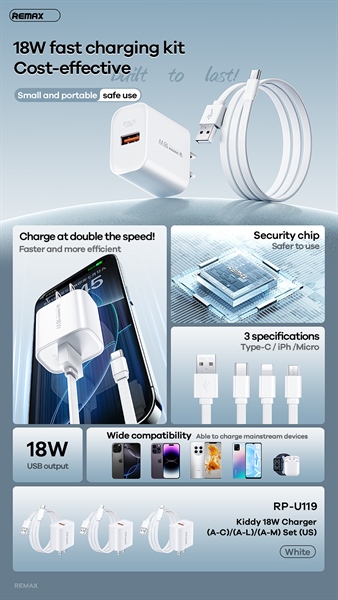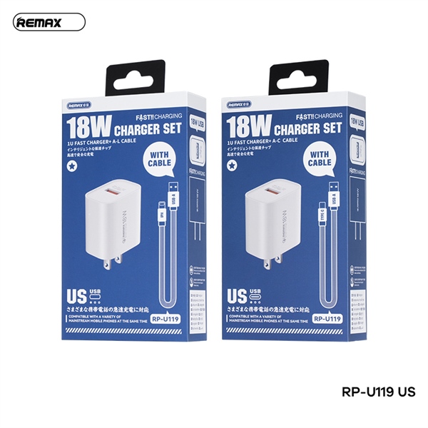 Bộ Sạc Điện Thoại Remax RP-U119 1 Cổng USB Kèm Cáp L PD 18W Cáp Dài 1m Chuẩn US (Trắng)