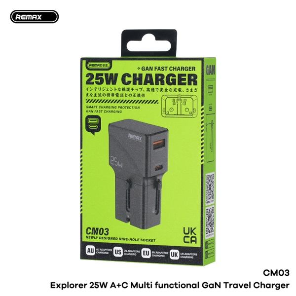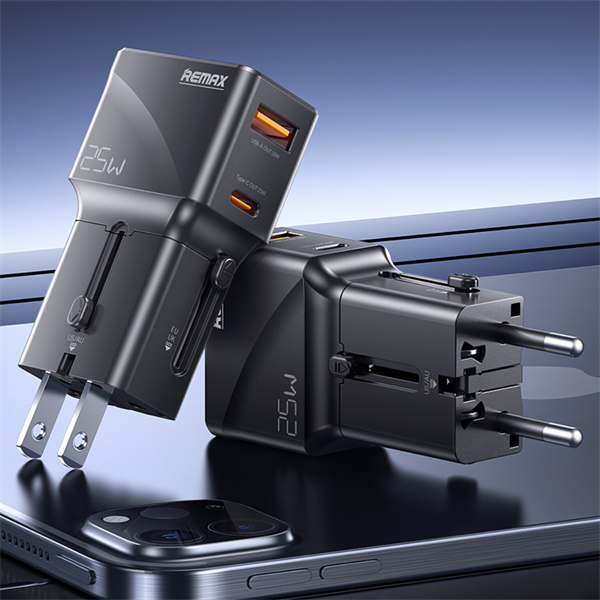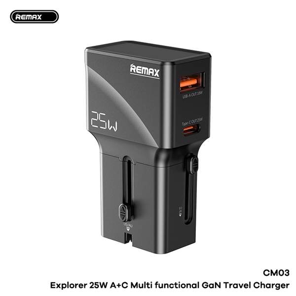 Bộ Sạc Du Lịch Đa Năng Remax CM03 1 cổng USB và 1 Cổng Type C Tích Hợp Phích Cắm AU/US/EU/UK 2500W+25W (Đen)