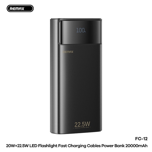 Pin Dự Phòng Sạc Nhanh Remax FC-12 20000mAh 1 Cổng C Kèm Cáp A+C+L 22.5W+20W Tích Hợp Đèn Pin Có Chứng Nhận CCC (Đen)