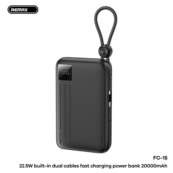 Pin Dự Phòng Sạc Nhanh Remax FC-15 20000mAh 1 Cổng U+C Tích Hợp Cáp C+L 22.5W+20W Chứng Nhận CCC (Đen)