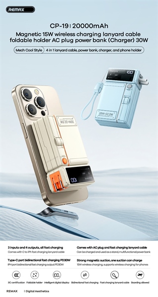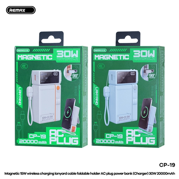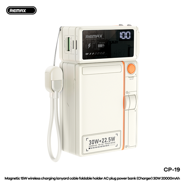 Pin Sạc Dự Phòng REMAX CP-19 20000mAh 1U+1C+1L Kèm Cáp C-L Sạc Ko Dây Từ Tính 15W Tích Hợp Giá Đỡ Tiẹn Lợi (Trắng)