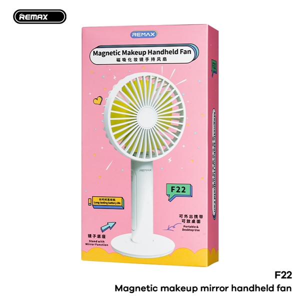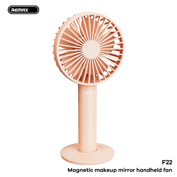 Quạt Cầm Tay Remax F22 Pin 1800mAh Công Suất 5W Tích Hợp Gương Trang Điểm Từ Tính Kèm Đế Để Bàn Tiện Lợi (Hồng)