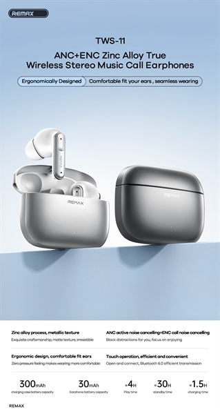 Tai nghe True Wireless Bluetooth V5.4 TWS-11 Pin 30mAh/300mAh Thiết Kế Nhám Sang Trọng Tích Hợp Chức Năng ANC+ENC (Xám)