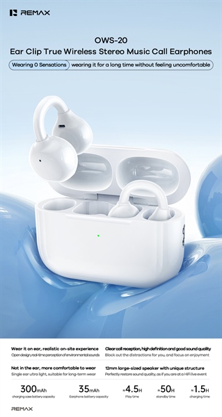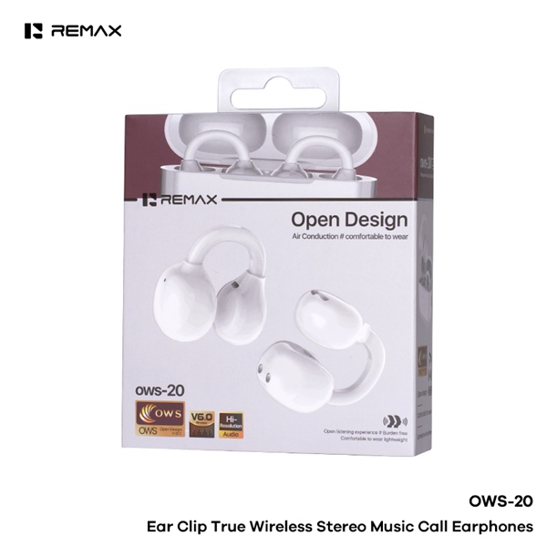 Tai nghe True Wireless Remax OWS-20 Bluetooth OWS V6.0 Pin 35mAh/300mAh Thiết Kế Tai Nghe Kẹp Vành Tai Open-ear (Trắng)